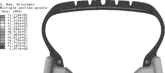如图5是充气压力为 200kpa 时在轮胎横断面上最大主应力的分布。