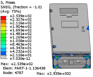 方案二:终端最大位移约为 3.24mm,位于终端的门板右下边角区域;最大应力约为 253.9mpa,位于底座安装孔区域,小于其材料(spcc)的屈服强度 270mpa,底座的屈服风险较小,说明增大底座的厚度可以大大增强结构的安全性能。