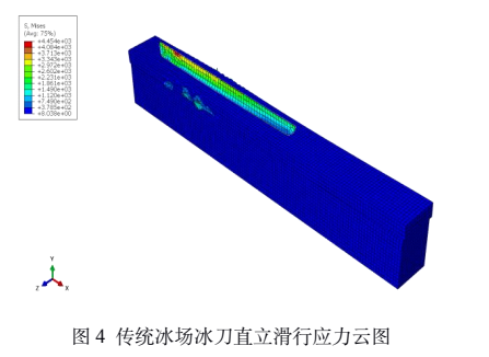 冰刀、冰及混凝土的材料参数[9]设置如下:冰刀材料为钢,弹性模量为 210gpa,泊松比为0.3;冰的密度为 [10],弹性模量为8.58gpa[2],泊松比为0.33[11];挤塑板的密度为 ,弹性模量为 6.6mpa,泊松比为 0.28;混凝土密度为,弹性模量为 30 gpa,泊松比为 0.2。冰刀与冰层之间的摩擦设为滑动摩擦,摩擦系数为 0.005[12],冰层与挤塑板间采用摩擦罚接触,摩擦系数设置为 0.1,冰层与混凝土层之间的摩擦设为切向罚接触,摩擦系数为 0.1。对混凝土层底面四周施加固定约束,在冰刀上表面设置耦合作用点,在作用点上施加运动员的运动参数,运动员在滑行中,施加自重荷载外、加速度 12m/s2、以及速度11.28m/s(女性运动员的平均速度),定义的有限元模型如图 1、图 2 所示。