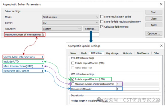 但是在cst 2024版本中仅包含1阶utd,而cst 2025版本中对utd的设置做了加强,用户可以自由的控制射线行为。本文我们就介绍下utd的这三个参数对射线行为的影响。