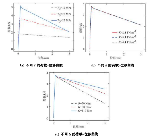 从图 8 (a)可以明显看出,在刚度 k 和断裂能 g 相同的情况下,荷载峰值点随着损伤起始强度 t0 的增加而增加。造成这种现象的原因是:相同的外部荷载给予模型相同的能量,t0 过大使荷载峰值点提高,该能量不能维持峰值点后的斜率下降速度正常。当 t0 过小时,引起荷载峰值点下降,这是由于内聚力单元承载的能量过大,进而引起下降段的曲线斜率大于正常的下降段曲线斜率。