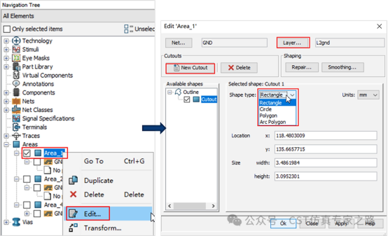 如下图所示,在导航树中选择area_1,点击edit,在弹出的对话框中,net处选择gnd;layer处选择第2层,即l2gnd。点击new cutout按钮,再选择开槽形状,有矩形、圆形、多边形和弧形多边形可供选择;此处选择矩形开槽。