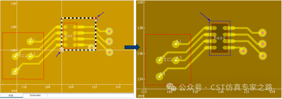 选择矩形开槽后,在pcb区域会出现一个黑白相间的矩形框,通过鼠标拖动矩形框的两个顶点可以调整开槽的大小;也可以在对话框中location一栏直接输入矩形开槽的坐标。最后点击apply按钮和ok按钮,完成开槽,如下方右图所示。