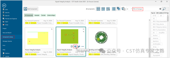 接下来将基于器件库中的模型来介绍如何在cst pcb工作室中对某一叠层进行开槽。点击component library,在右上角搜索框中输入关键词:pcbs & packages进行筛选,找到signal integrity analysis,并选择open as a project,在cst中打开此仿真工程。