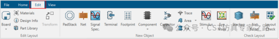 在cst pcb studio进行信号完整性(si)和电源完整性(pi)仿真的过程中,可能需要对导入的pcb进行修改。在cst pcb工作室edit功能区中可以通过编辑trace、net、stackup、via、padstack的属性对信号走线、网络、叠层、过孔和焊盘进行修改,如下图所示。