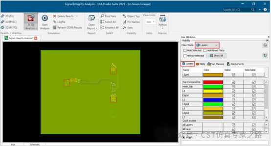 在右侧的view attributes窗口中,color mode一栏选择layers,以便按层查看pcb,可以看到此pcb总共有7层,其中第2层、第4层、第6层为地层。本文以在第2层参考地上开矩形槽为例进行展示。