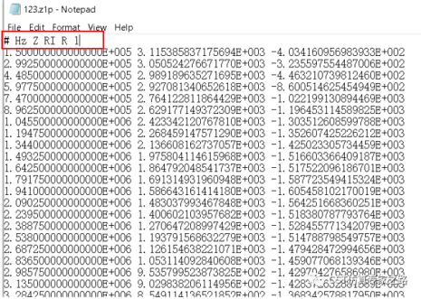 第七步,打开数据文件,删除原有的表头文件,在第一行按照下面的格式输入“# hz z ri r 1”。如果数据类型是“幅值 相位”,那么第一行的格式就是“# hz z ma r 1”。保存,并将文件格式改为z1p。
