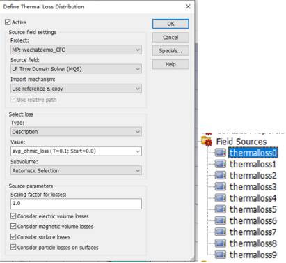 3.在新工程中设置sources and loads>thermal losses,只需在project中选中原电磁仿真工程,source field和loss等信息自动被填写,选择value将我们设置的10个avg_ohmic_loss一一导入。